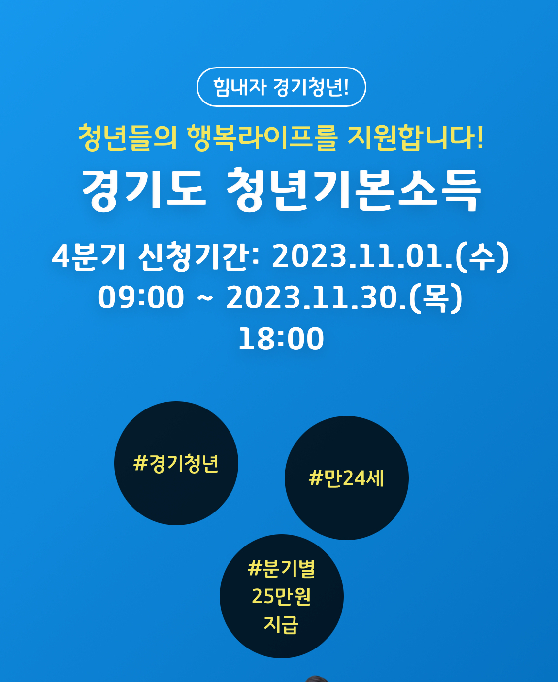 경기도에 거주 중인 만 24세 청년들을 대상으로 경기도에 3년 이상 계속 거주하거나 , 합산하여 10년 이상 거주한 청년들에게 지급합니다. 지원내용은 분기별도 25만 원씩 최대 4분기 100만 원 지원합니다. 즉, 1년 동안 최대 100만 원을 받을 수 있습니다.