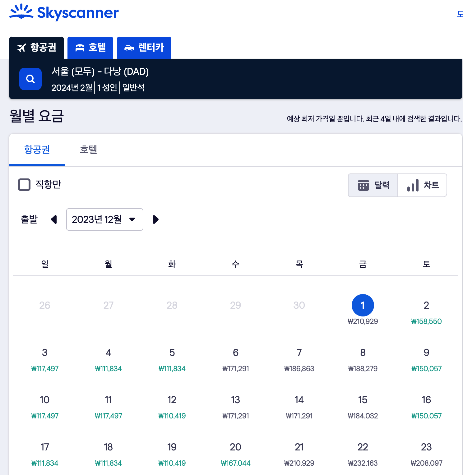 유연한 날짜선택이 가능하다면 항공권을 저렴하게 구매할 수 있는 좋은 기회입니다. 주말보다는 화, 수요일출발하는 항공권이 저렴하게 구매할 수 있습니다.